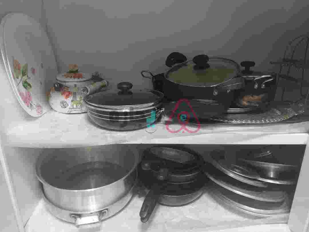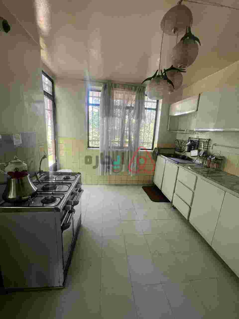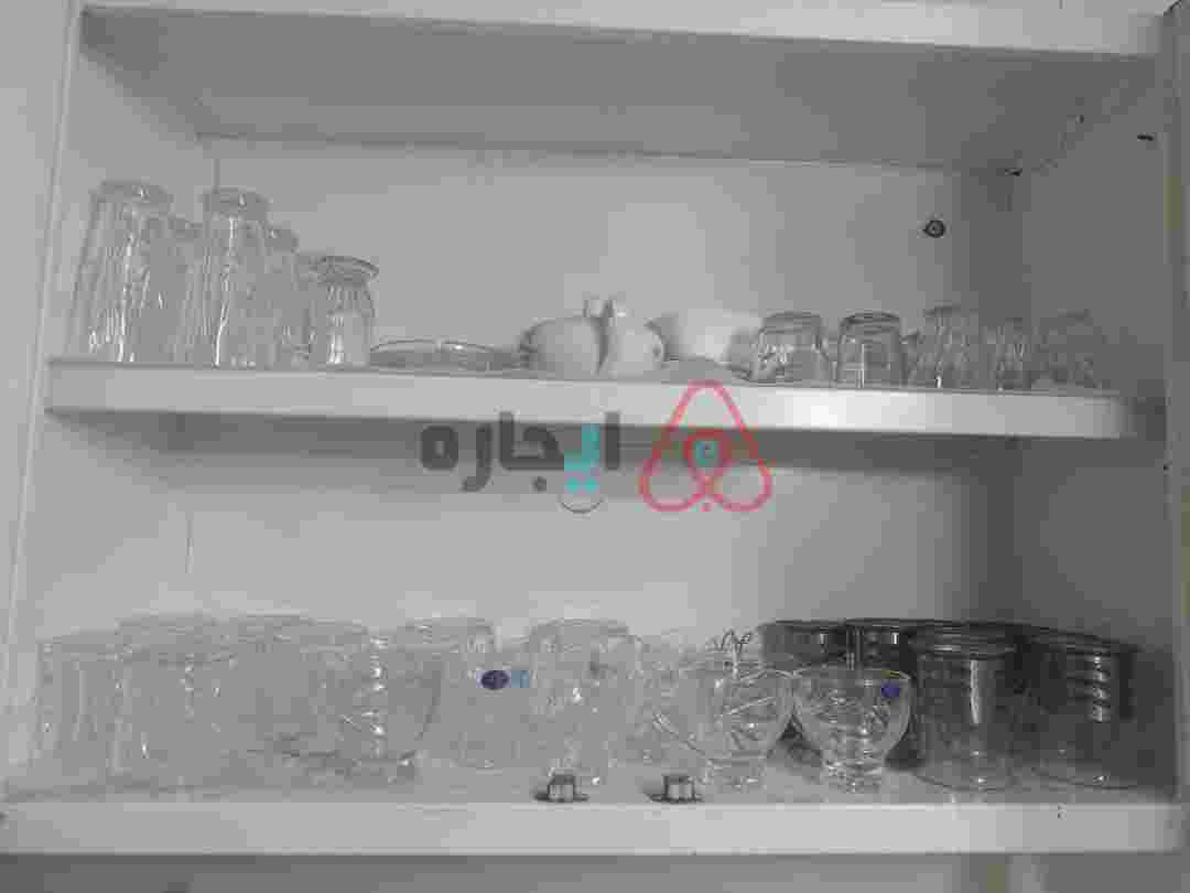 آشپزخانه کامل: شامل اجاق گاز، یخچال، کابینت، ماشین ظرفشویی، سیخ، قابلمه و وسایل سرو غذا.